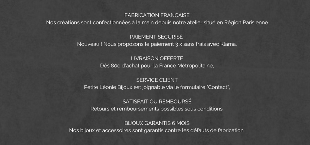 Par souci d'éthique, nos bijoux et accessoires sont réalisés à la commande. Le délai entre le passage de votre commande et la réception de votre colis est variable selon notre charge de travail et la période de l'année.