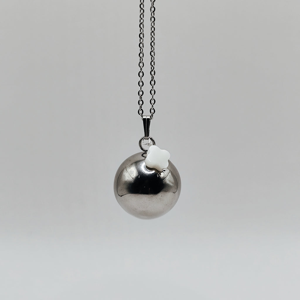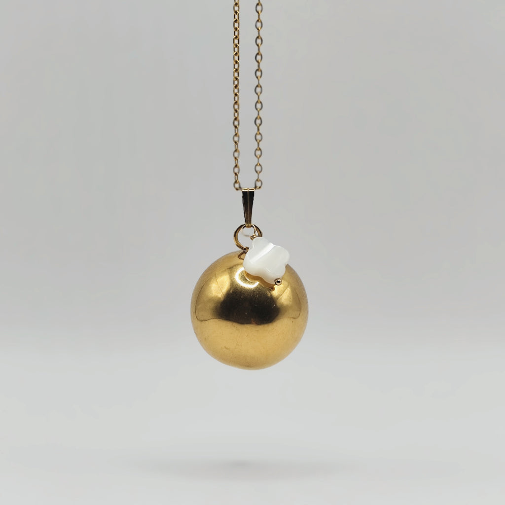 Délicatement suspendu au creux du ventre, le bola de grossesse accompagne la future maman tout au long de son voyage vers la maternité. À chacun de ses mouvements, il diffuse un tintement doux et apaisant, une mélodie subtile que le bébé reconnaît dès les premiers mois de la grossesse.