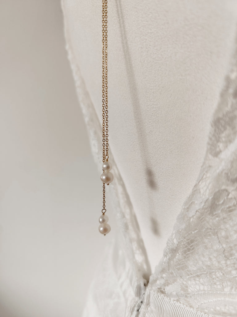Collier de dos Noémie en acier inoxydable doré ou argenté, et sa cascade de perles d'eau douce.