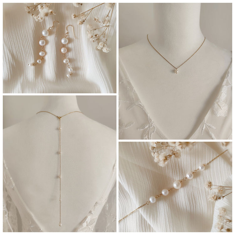 Le collier de dos Juliette est en chaîne acier inoxydable doré ou argenté et perles d'eau douce.