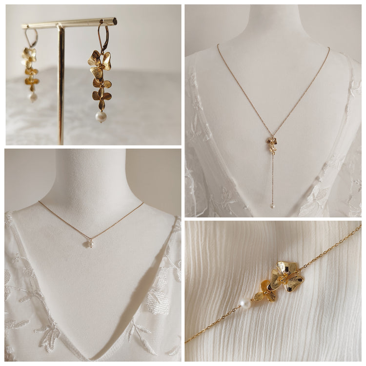 Les bijoux se composent de pendentifs orchidées laiton dorés à l'or 24 carats, de perles d'eau douce, de chaînes en acier inoxydable doré et de crochets d'oreilles en or 14 carats ou en argent 925.