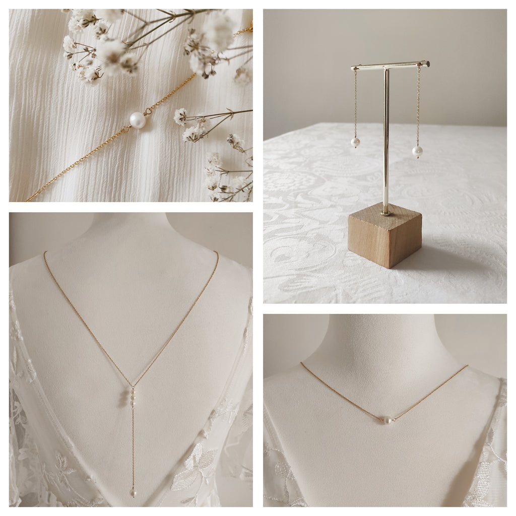 - Perle d'eau douce 5 mm tissées sur un fil gold filled 14 carats ou acier argenté.